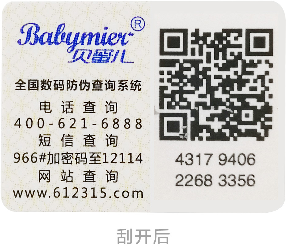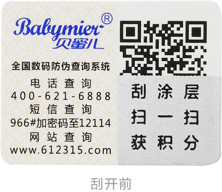 产品包装上,,,贴有一个如下图的防伪获积分标签,,,刮开银灰色涂层,,,,可见二维码和防伪数码。。